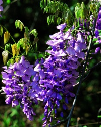 Chinese wisteria [Wisteria sinensis (Sims) DC.] and Japanese wisteria [W. floribunda (Willd.) DC.] are deciduous high climbing, twining, or trailing leguminous woody vines with long pinnately compound leaves and showy dangling clusters of spring flowers that appear before leaves. Chinese and Japanese wisterias are difficult to distinguish due to hybridization. Both colonize by vines twining and covering shrubs and trees and by runners that root at nodes when vines are covered by leaflitter. Seeds are water dispersed along riparian areas, but the large size of the seeds is a deterrent to animal dispersal. Still sold and planted with many cultivars. Resemble native or naturalized American wisteria [W. frutescens (L.) Poir.], which occurs in wet forests and edges and sometimes forms large entanglements but flowers in June to August after leaves develop.