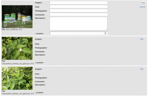 - After upload, the browser is redirected to a page showing what was just uploaded. This is usually used by photographers rather than administrators since administrators can directly edit the true image record rather than the temporary record that is accessed here. Information can be added to each image using the following procedure