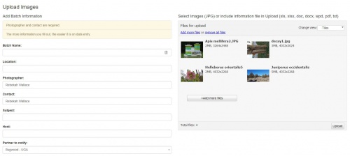 For the purpose of notifying the photographer or contributor and having one centralized work flow for images being entered into the Bugwood Image Database, all uploads of digital images that are not scans from slides that have been indexed and labeled for entry into the Bugwood Image Database.