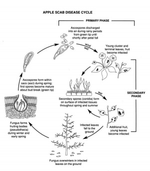 This disease, caused by the fungus Venturia inaequalis (anamorph Spilocaea pomi), may be quite severe when rainy, cool weather occurs in the spring. Fungal spores are produced in early spring on dead, fallen apple leaves about the time buds begin to develop. These spores are splashed by rain and blown by wind to land on developing plant tissue and initiate infections. After spots appear on the newly formed leaves, more spores are produced that spread infection to other parts of the tree. Again, rainy weather greatly encourages spore spread and infection during the secondary phase of spore production. The fungus overwinters on fallen leaves.