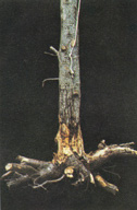 First noticeable symptoms may be a decline of the crown and yellowing leaves, which fall prematurely or remain small and scant. On small trees, all foliage may die. White, fan-shaped mycelial fungus mats may form on the roots and root collar, causing decay. These mats extend upward between bark and wood and cause rot in both heartwood and sapwood.