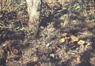 In fall dense clusters of yellow-brown mushrooms develop at the base on the infected tree. These mushrooms are 4 to 6 inches (10 to 15 cm) high and have a broad, brown, scaly cap 1/2 to 2/3 inch (12 to 17 mm) in diameter and whitish gills. They produce wind-borne spores that germinate on exposed tissue of living or dead trees. The fungus spreads through the roots of infected trees and penetrates living roots of adjacent, healthy trees through root grafts or wounds.